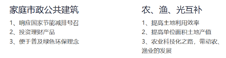 分布式發(fā)電廣泛適用于廠房、住宅、陽(yáng)光 房、車庫(kù)等屋頂日照面,建設(shè)用地集約,審批 流程簡(jiǎn)單,不需進(jìn)行土地規(guī)劃和審批,利用太 陽(yáng)能發(fā)電,靠近負(fù)載,沒(méi)有輸變電損失,效率 高,實(shí)現(xiàn)自發(fā)自用,余電上網(wǎng)。