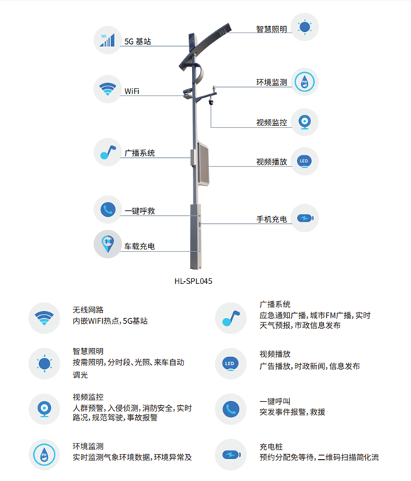 智慧燈桿是整合了視頻監(jiān)控、WIFI熱點、5G微基站、智慧充電、一鍵報警、LED大屏、環(huán)境監(jiān)測、廣播音柱等硬件設(shè)備,通過硬件信息感知和大數(shù)據(jù)交互技術(shù),涵蓋了智能照明、智慧交通、信息發(fā)布、一鍵求助、氣象檢測、環(huán)境檢測等功能。