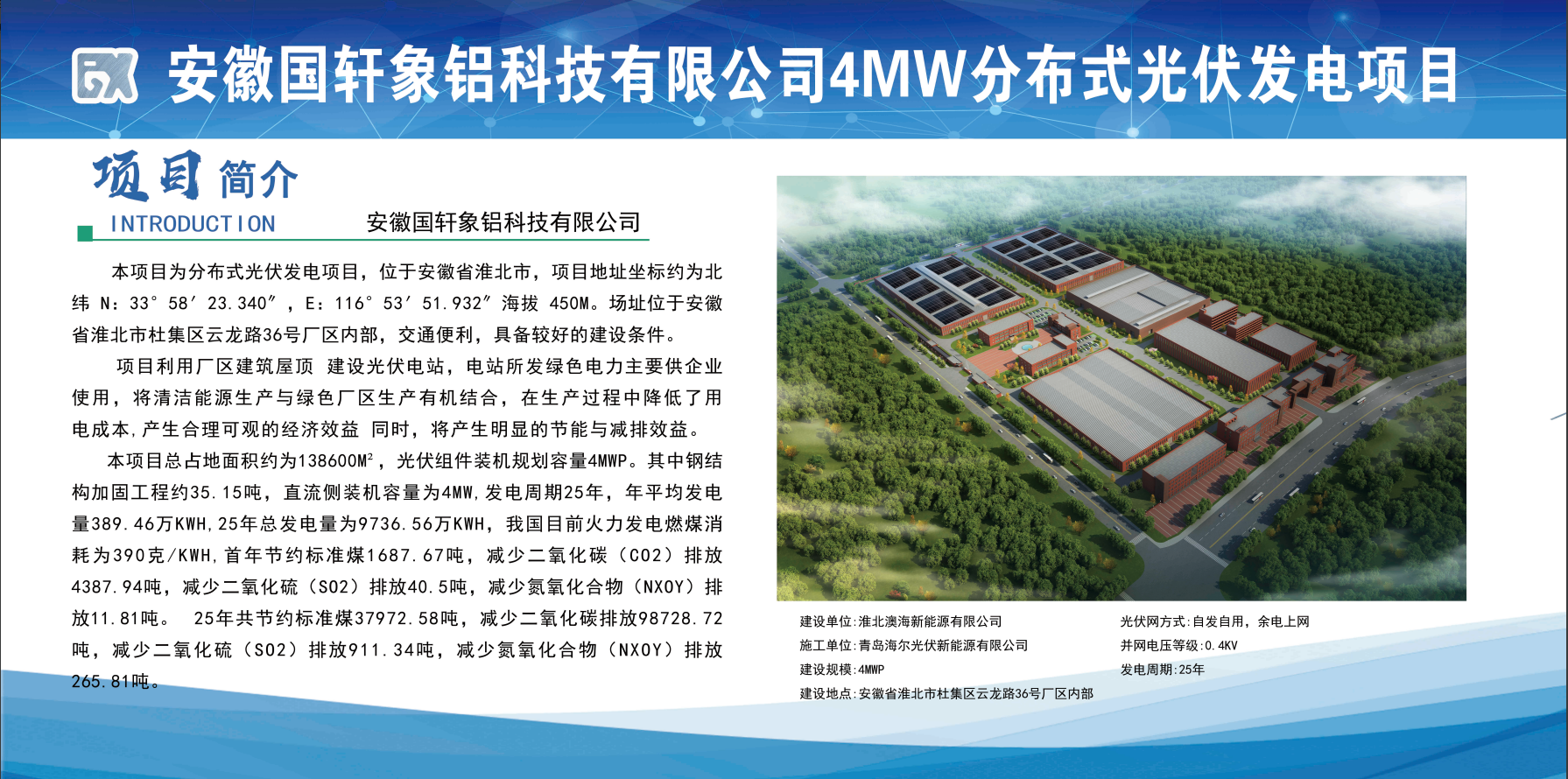 該項目位于安徽省淮北市,項目采用“自發(fā)自用,余電上網(wǎng)”模式,遵循技術(shù)創(chuàng)新、經(jīng)濟環(huán)保、安全高效、科學實用、因地制宜的指導思想和設計原則,最大化保證電站發(fā)電量,提高光伏發(fā)電效益。