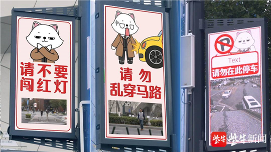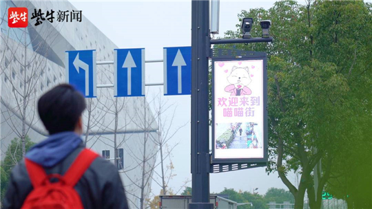 “歡迎來到喵喵街?!碑?dāng)行人從金沙江西街與樂山路交會處進(jìn)入喵喵街,掛載于路燈上的信息屏便出現(xiàn)歡迎界面,音響開始播放歡迎音效。