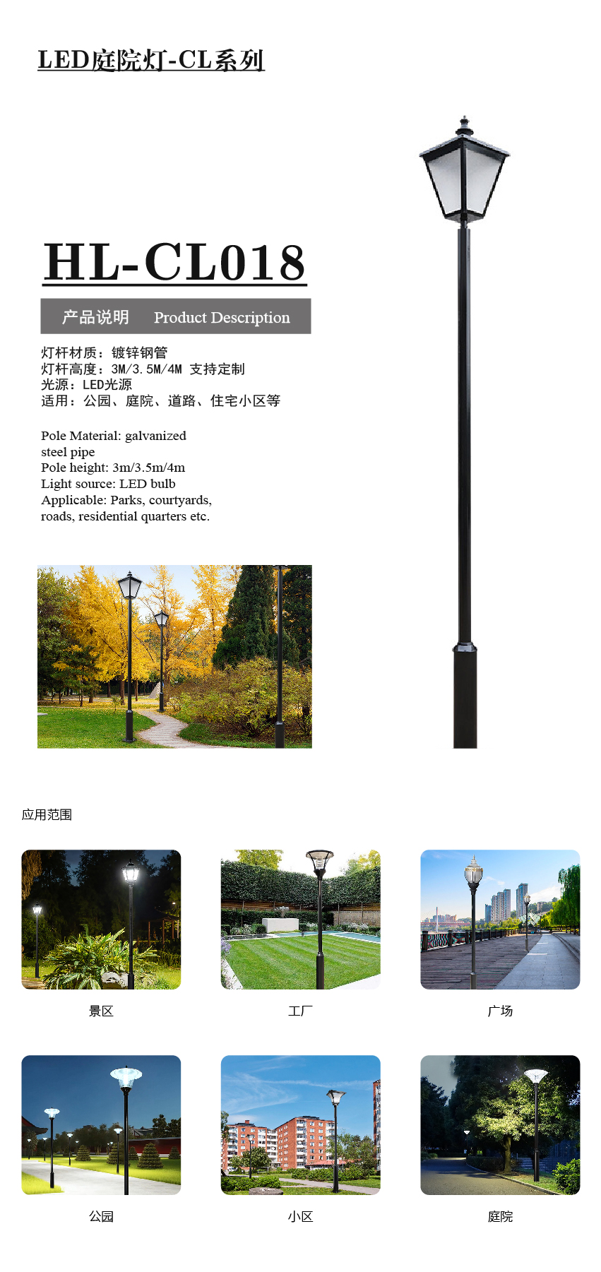 產(chǎn)品型號:HL-CL018庭院燈 應(yīng)用領(lǐng)域:產(chǎn)品中心 品牌:合力四通 銷售熱線:0511-85336035159-5127-9212